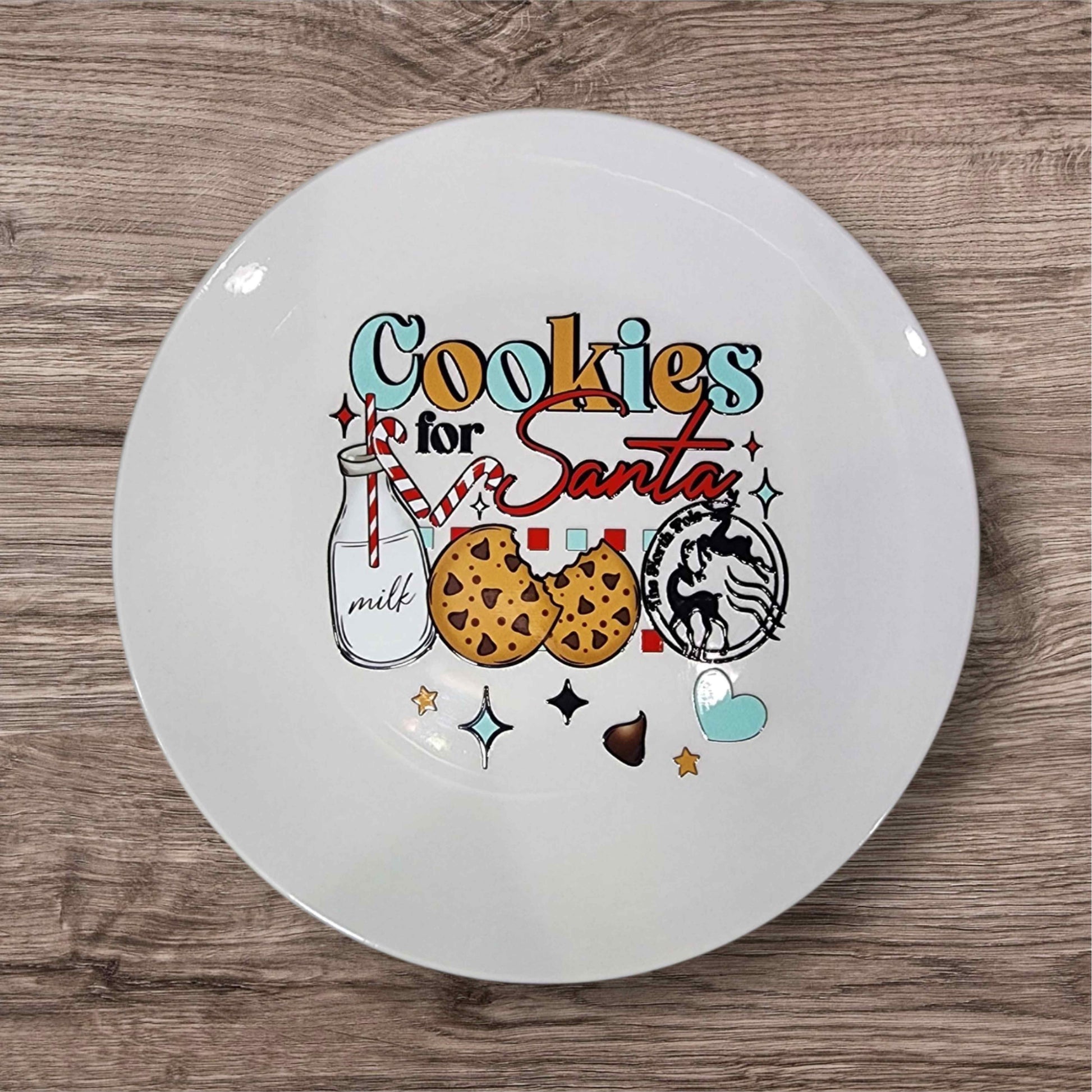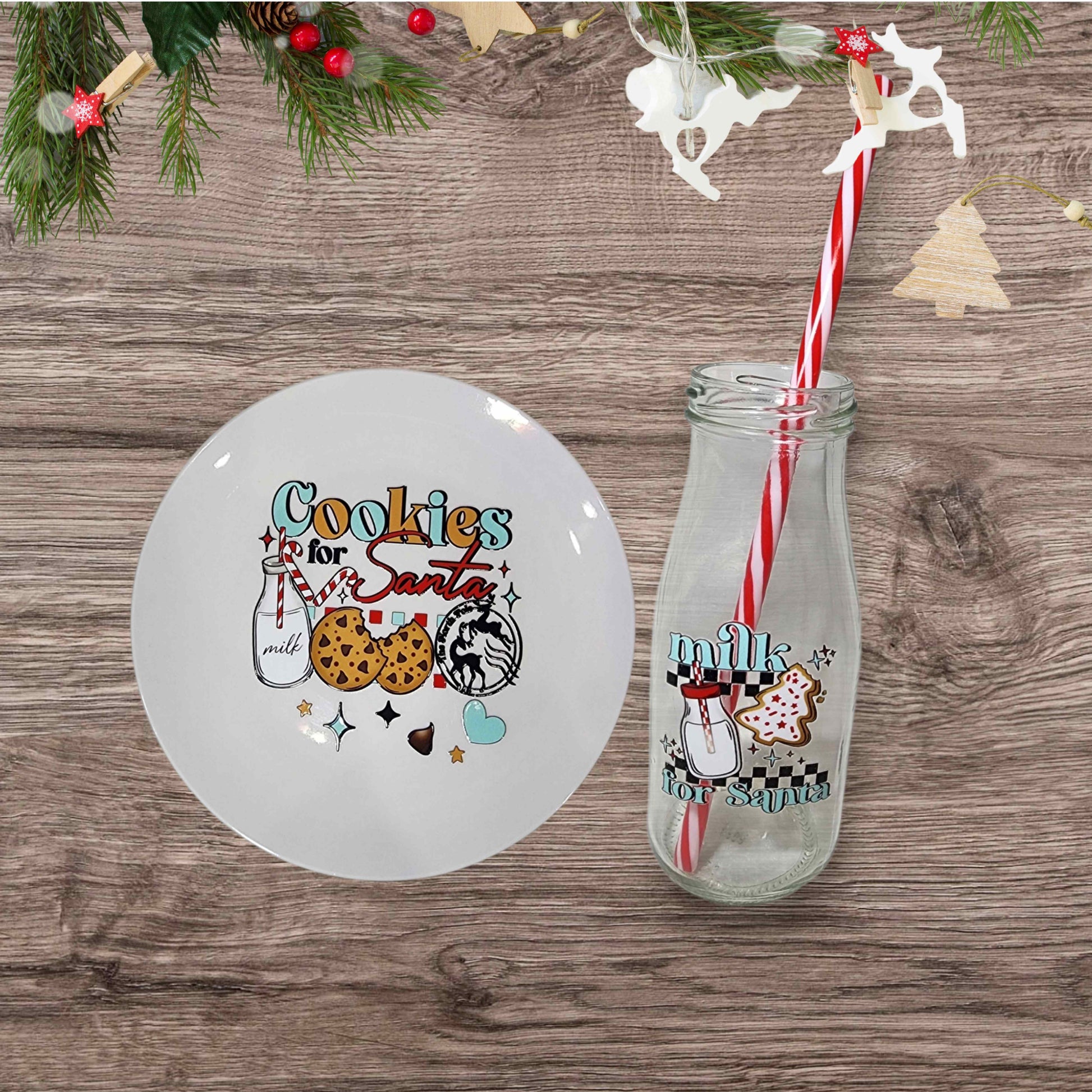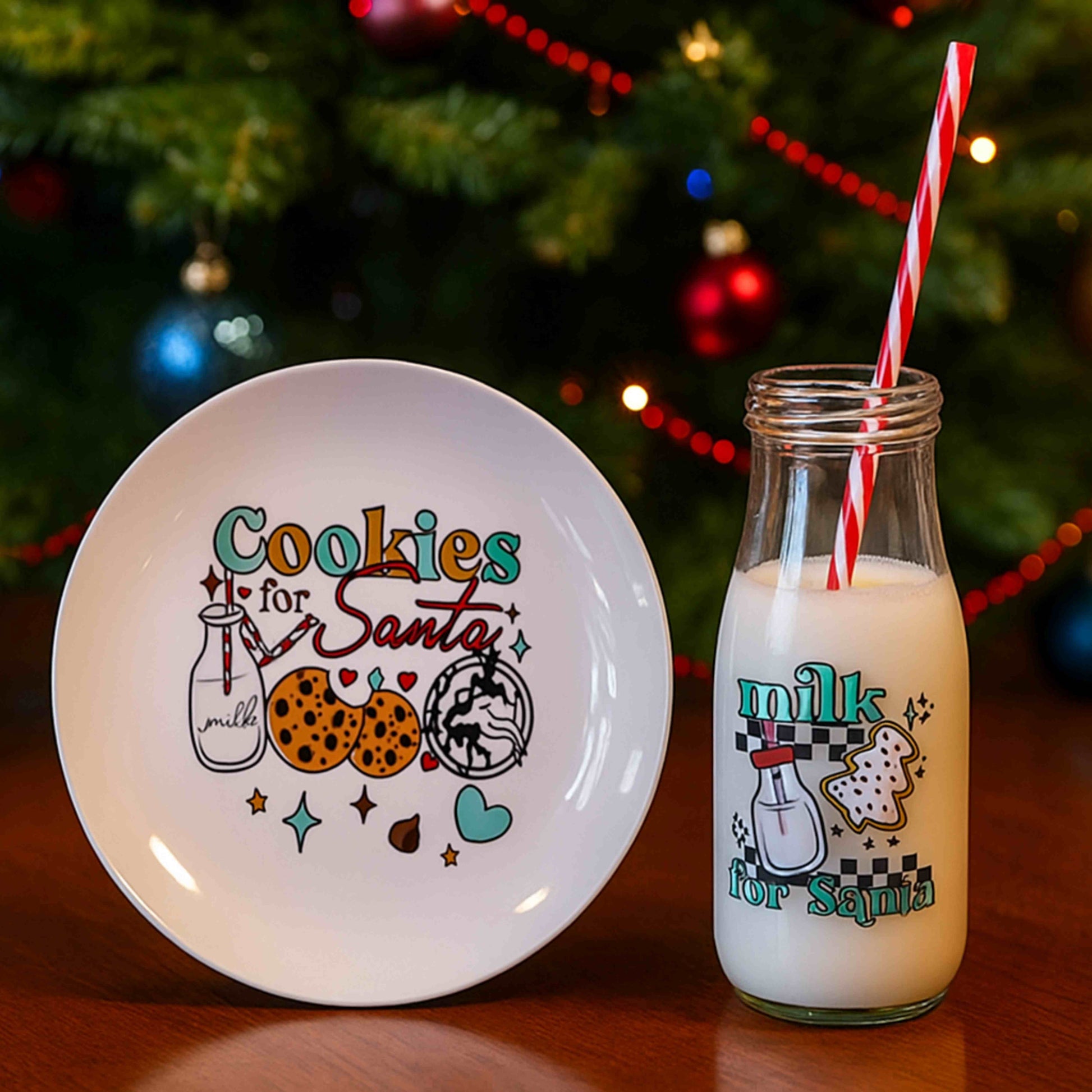 A festive Cookies for Santa plate and Milk for Santa glass bottle set, perfect for Christmas Eve traditions. This adorable holiday set creates the perfect scene for leaving treats for Santa. Ideal as Christmas decor, holiday kitchenware, or a family Christmas Eve tradition set.