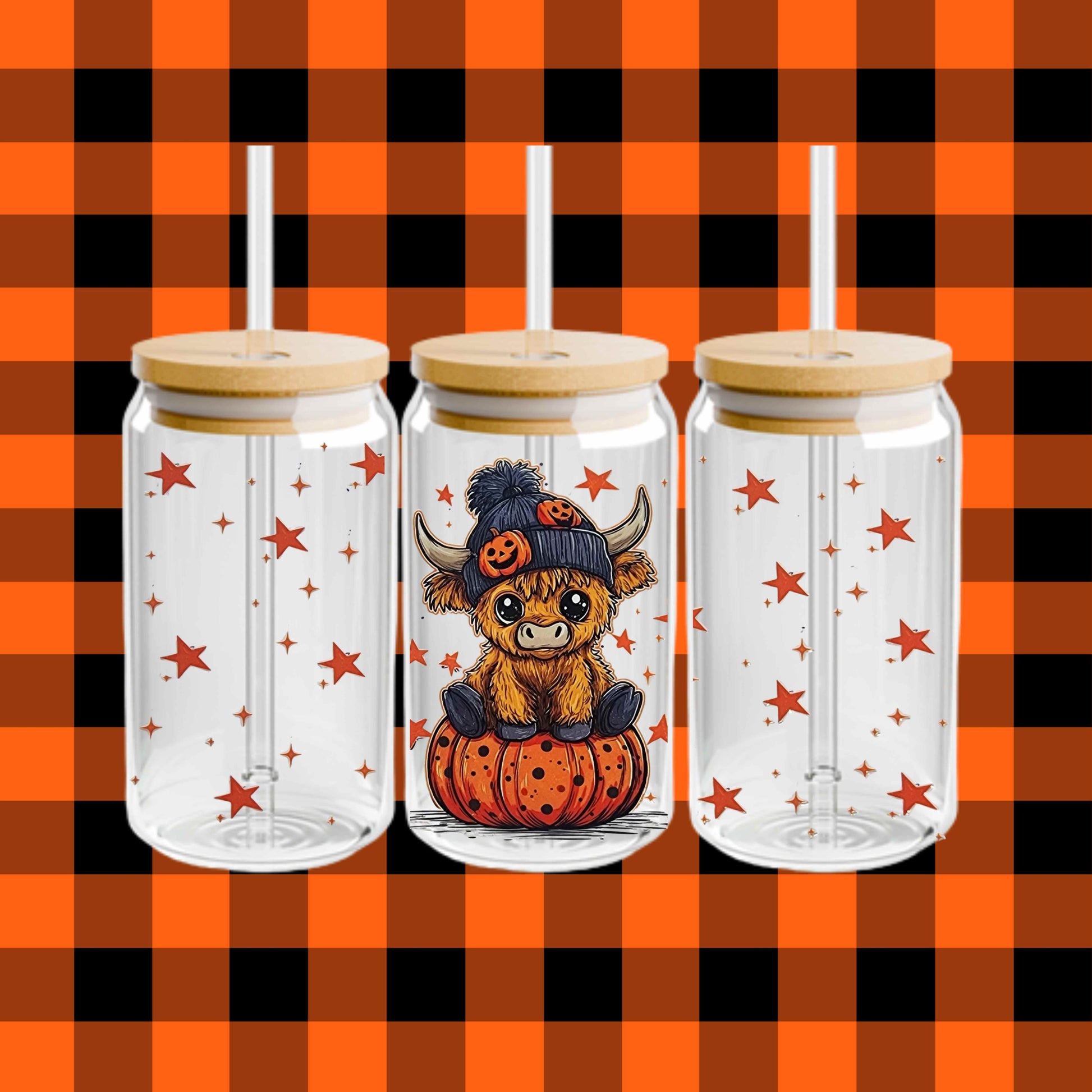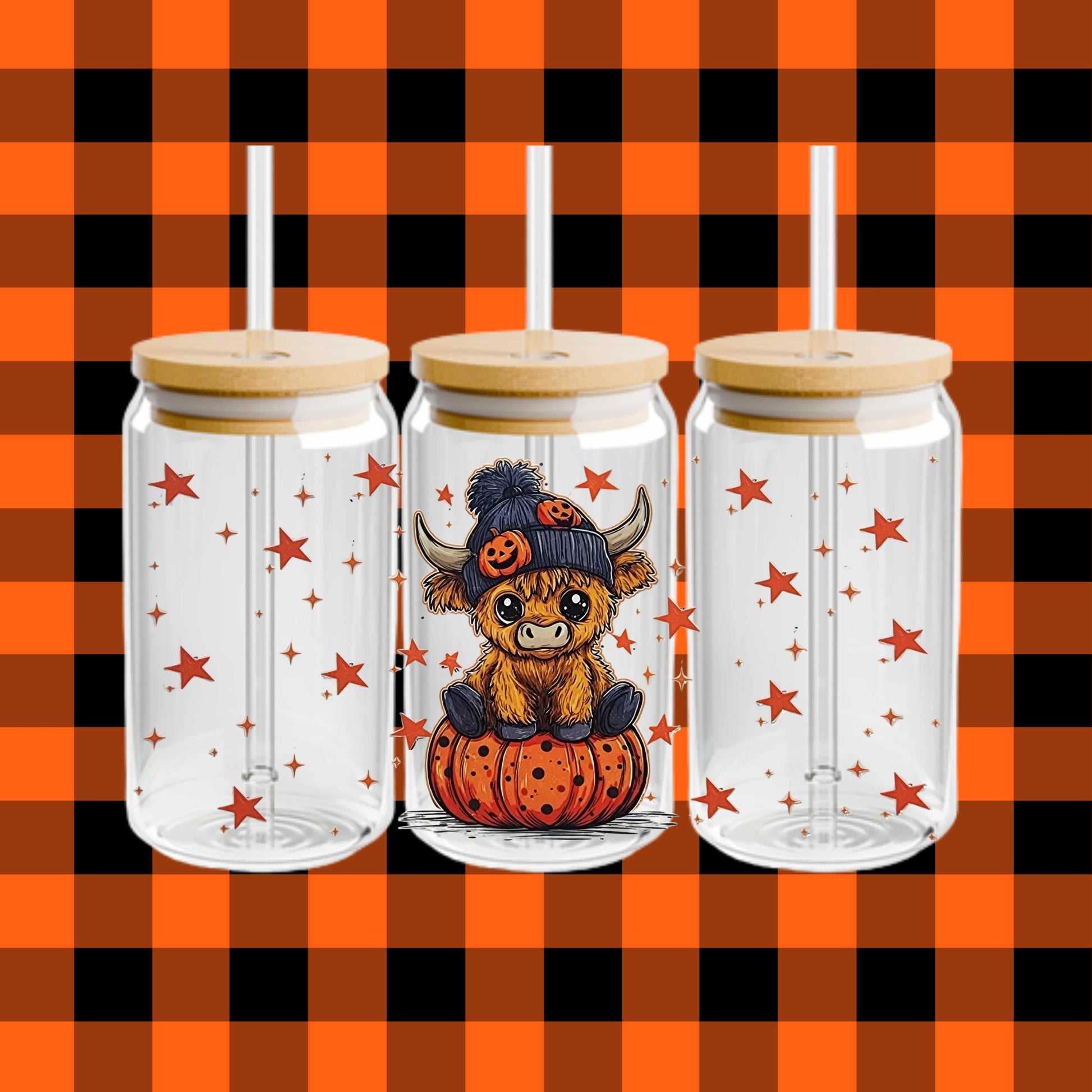 Cute Halloween Cow 16oz Acrylic or Glass Coffee Tumbler with Lid & Straw, Fall UVDTF Cup